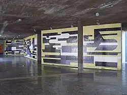 | Untitled mural | A yellow, white, and black striped mural over panels on a zigzag wall | 1956 | Faculty of Architecture and Urban Planning, ground floor, in the corridor outside the Taller Galia, opposite mural below | AU12 |