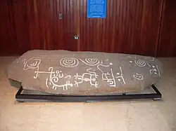 Just inside the main entrance of the Central Library is a stone depicting a petroglyph, carved by ancient indigenous people of Venezuela. The story of its placement is that it is the first book of the library, waiting for somebody to come and read it, but nobody can because the language is lost.[10] Based on comments from scholars and university figures, it has been deemed that these people do not consider the petroglyph stone to be part of the university's heritage, nor as one of the campus works of art; the same distancing is seen with other elements of indigenous culture across the country.[11] Map reference on this page: L5.