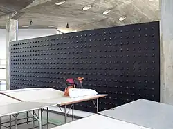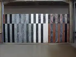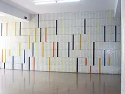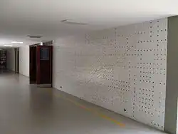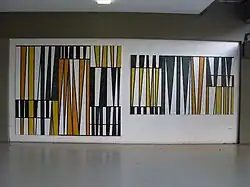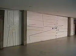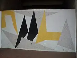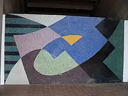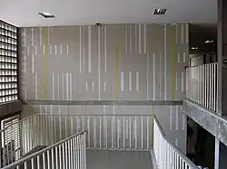 | Untitled mural | Rectangle and similar shapes in various shades of grey create a pattern on a wall behind stairs, there are some orange rectangles near the top | 1953 or 1954 | In the atrium of the Aula Magna[26] | A2 |