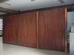 | Untitled acoustic frames | Two acoustic frames. They are made of two-colored wood, and are paneled with layers of thin slats alternately horizontal and vertical that have been stained in places to reflect the recurrent stripe designs present in Manaure's murals. One has an outer layer with vertical slats and horizontal stripes in red; the other has an outer layer with horizontal slats and vertical stripes in black. They are of obscure geometric shapes rather than having smooth edges. | 1954 | One on each side of the stage inside the Sala de Conciertos | PC14 |