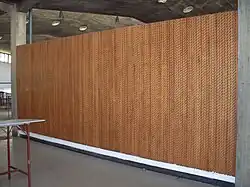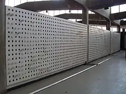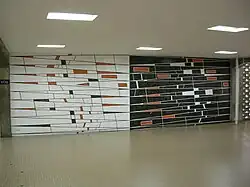 | Untitled mural | A white tiled wall, with several colored rectangles, all standing on a short end, scattered across it. Each tile is bordered by metal rods. | 1954 | Main building of the Faculty of Engineering | |