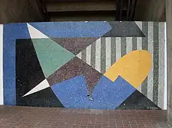 | Untitled mural | An abstract geometric mural in shades of blue, red, white, and black. There are four unequally-sized sections marked by different background colors, patterned with lines and various shapes. | 1954 | In the covered walkway next to the entrance of the central library. It is opposite Vasarely's Positif-Negatif. | PC7 |