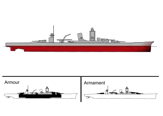 Design B-64 was originally intended to be part of Japan's Night Battle Force, a force that would attack an enemy fleet's outer defence ring of cruisers and destroyers under the cover of darkness. After penetrating the ring, Japanese cruisers and destroyers would launch torpedo attacks on the enemy's battleships. The remainder of the enemy would be finished off by the main fleet on the following day. The B-64s were intended to support the lighter cruisers and destroyers in these nighttime strikes.[21] This strategy was altered when the Japanese learned the specifications of the United States' Alaska-class large cruisers. The design was enlarged and redesignated B-65; their purpose would now be to screen the main battle fleet against the threat posed by the fast and heavily armed Alaskas.[22][23] With war looming in 1940, the Japanese focused on more useful and versatile ship types such as aircraft carriers and cruisers; the Japanese defeat at the 1942 Battle of Midway meant that the ships were postponed indefinitely, and with more important strategic considerations to worry about, the ships were never built.[24][25]
