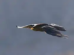 Bustards are large terrestrial birds mainly associated with dry open country and steppes in the Old World. They are omnivorous and nest on the ground. They walk steadily on strong legs and big toes, pecking for food as they go. They have long broad wings with "fingered" wingtips and striking patterns in flight. Many have interesting mating displays.