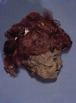 The Stidsholt Woman is the severed head of a woman discovered in 1859.[39][40] She was decapitated by a blow to the third and fourth vertebrae. Her hair is a dark red, which comes from the chemicals in peat bogs. Her hair had been tied into a knot, and fastened with a woven band, which was destroyed.[39][40] Her head was never scientifically dated, and the rest of her body was never found.[39] Her hair was 51 cm (20 inches) long. She is also known as the Stidsholt Fen Woman and the Stidsholtmose Woman.[40] Her head is on display in the Copenhagen Museum in Denmark.[41] |