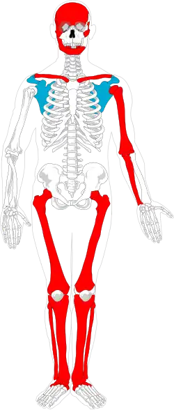 This completely skeletonized bog body of undetermined sex was either oversampled, lacked preservation or sustained damage during World War II. Surviving bones are marked red on image. | |