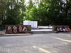The cemetery was created from land set aside in 1903, with the first burial taking place on 28 May 1905. It was mainly a burial location for the poor of the area, as well as soldiers and sailors who died in the First World War.[1] It rose to prominence in the Second World War when it became a site of numerous mass graves of those who died in the siege of Leningrad from 1941 to 1944.[1] Since then leading figures from a variety of sections of society have been interred in the cemetery. Saint Petersburg's history as a naval base have made the cemetery a popular location for naval officers. Those buried at the Serafimovskoe Cemetery include Giorgi Abashvili, Vladimir Alafuzov, Ivan Yumashev, and Mikhail Zakharov. There are also memorials to several maritime accidents and disasters, including the sinking of the ships Mekhanik Tarasov and Polessk, and the loss of the submarines Kursk and Komsomolets. On 6 July 2019 the fourteen men who died in a fire aboard the submarine Losharik were interred in the cemetery.[2] A memorial also commemorates the dead of the 1981 Pushkin Tu-104 crash, which included a large number of Soviet Navy officers. Other military figures interred in the cemetery include Soviet Air Force Lieutenant General Dmitry Alexandrovich Medvedev, two flying aces of the Korean War; Anatoly Karelin and Mikhail Mikhin, and Major General Sergei Ivanovich Tiulpanov, who commanded the Propaganda Administration of the Soviet Military Administration in Germany. Among the many other Heroes of the Soviet Union who were buried here are Boris Alekseyev, Nikolai Archakov, Ivan Afanasyev, Anton Gurin, Pavel Pavlov, and Fyodor Simakov.[1]