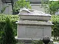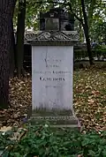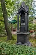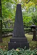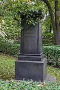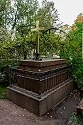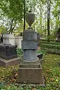 Over time the cemetery became a popular and prestigious burial ground for those of many areas of society. The wealthy merchant A.I. Kosikovsky was buried under a monumental sarcophagus on a high pedestal surmounted by a canopy on eight fluted columns.[4] Opposite it stood a similarly grand monument to the statesman Pavel Demidov, which has since been lost.[4] In 1857 the remains of the composer Mikhail Glinka were returned from Berlin and buried in the cemetery, with a grand monument erected two years later to the design of architect I. I. Gornostayev, with sculptures by Nikolay Laveretsky.[4][9] On 1 February 1881 the author Fyodor Dostoevsky was buried in the cemetery, with a similarly large monument.[4][10] During the 1880s composers Modest Mussorgsky and Alexander Borodin were buried in the northern part of the grounds, with Pyotr Ilyich Tchaikovsky following in 1891.[4][11][12][13]