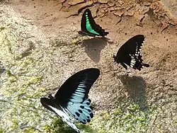 Indian swallowtails are spread over all the biomes/ecoregions of India. The Malabar banded peacock (Papilio buddha) and the Malabar banded swallowtail (Papilio liomedon) fly at sea level while the Apollos (Parnassius species), are to be found only in the highest alpine meadows of the Himalayas. Some species such as the common Mormon (Papilio polytes) and the blue Mormon (Papilio polymnestor) fly at ground level whereas others, such as the tailed jay (Graphium agamemnon) are normally found flying high in the forest canopy. The lime butterfly (Papilio demoleus) is a creature of arid scrub-land, occasionally being spotted even in the Thar Desert, while the tropical evergreen forests have their own representatives, such as the red Helen (Papilio helenus), the common bluebottle (Graphium cloanthus) and the Malabar raven (Papilio dravidarum).[3] Indian papilionids such as the common Mormon (Papilio polytes) and great Mormon (Papilio memnon) show polymorphism with many mimetic female forms.[4][5]