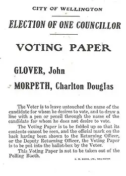 Local by-elections normally have lower turnouts than full local body elections. A noted case occurred in 1960 when a vacancy triggered a by-election which had a turnout of only 7.7% of voters, prompting Mayor Frank Kitts to label the light turnout a "deplorable state of affairs" as "...there were responsible and worthwhile citizens who were prepared to devote their time and money in service to the people".[ 1] By-elections on the city council were on occasion deferred if a substantial majority of the council agreed to fill the vacancy by appointment, resulting in the highest polling unsuccessful candidate at the previous election being appointed to the council unless there is a public demand for a poll to be held (known as extraordinary vacancies). This arrangement has happened several times such as in 1973 when Olive Smuts-Kennedy resigned her seat and Seton Nossiter was appointed to replace her, in 1979 when Irvine Yardley resigned and was replaced with Tala Cleverley after several higher polling candidates declined the appointment,[ 2] and in 1985 when Leone Harkness resigned and her council seat which was taken by Bruce Harris.[ 3]