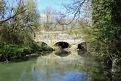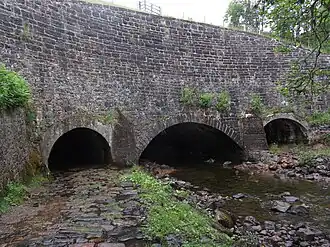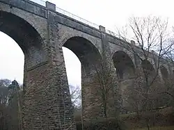 Grade II listed stone aqueduct built 1829-31, crosses the B5090 road . Stone embankments to each side, the river Dean was displaced by this and runs in a tunnel under the left side.