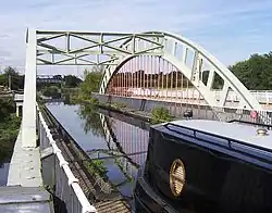 Crosses the Manchester Ship Canal . Swings to let large vessels pass below.