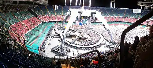 Concerts have been held at the Millennium Stadium in Cardiff, Wales, since the stadium's opening in 1999. The musicians who have played at the stadium include Tina Turner, Beyoncé, Spice Girls, The Rolling Stones, Rod Stewart, Paul McCartney, Madonna and Rihanna. The highest concert audience at the stadium was 73,354, who saw U2 in 2009.[1] In 2018 Ed Sheeran performed for a record-breaking 4 nights at the Stadium on his ÷ Tour.[2] The stadium's total seating capacity for sporting events is 73,434.[3]