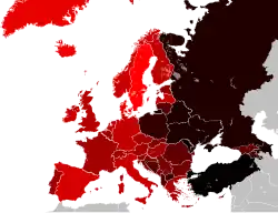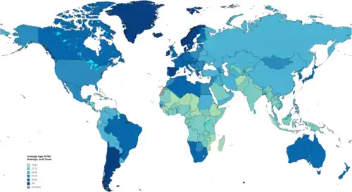This is a list of countries by age at first marriage. The list is current from contemporary surveys. It does not treat the topic in history. Currency of information varies by country. Because the age distribution of people at first marriage is skewed with a longer tail towards older ages,[1] the majority of people marry before the average age of first marriage. The median age is a more precise representation of when the majority of people marry; for most reporting sources, however, only the average age at marriage is reported.