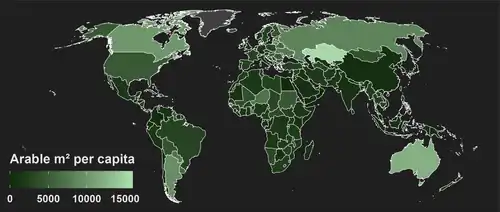Data are for the year 2021, and are from the UN FAO unless otherwise specified.[1][2] Locations with no arable land are omitted.