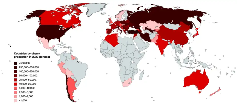 This is a list of countries by cherry production measured in metric tonnes from the years 2016 to 2022, based on data from the Food and Agriculture Organization Corporate Statistical Database.[1][n 1] The estimated total world production for 2022 was 4,358,852 metric tonnes, increasing by 1.9% from 4,277,298 tonnes in 2021.[1] Turkey was the largest producer of cherries, accounting for over 19% of global production.