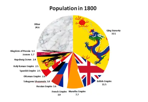 This is a list of countries by population in 1800. Estimate numbers are from the beginning of the year, and exact population figures are for countries that were having a census in the year 1800 (which were on various dates in that year). The bulk of these numbers are sourced from Alexander V. Avakov's Two Thousand Years of Economic Statistics, Volume 1, pages 21 to 24, which cover population figures from the year 1800 divided into modern borders. Avakov, in turn, cites a variety of sources, mostly Angus Maddison. Italian sub figures are derived from elsewhere.[1] Other figures come from Jan Lahmeyer's website,[2] which in turn is based on a variety of sources.[3]