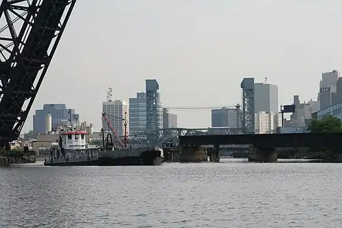 The Lower Passaic River in New Jersey is the section of the Passaic River below the Great Falls which flows over the Dundee Dam to the river mouth at Newark Bay in the northeastern part of the state. Its midpoint generally delineates the Essex–Hudson and Passaic–Bergen county lines. Numerous spans, mostly moveable bridges, have been built over of the lower reaches of the river, which is tidally influenced to the dam at about mile point (MP) 17.4 and channelized to about MP 17. Once one of the most heavily used waterways in the Port of New York and New Jersey, it remains partially navigable for commercial marine traffic. While requests have significantly diminished since the mid-late 20th century, the bridge at MP 11.7 and those downstream from it are required by federal regulations to open with advance notice, with the exception of the first at MP 1.8, which is staffed and opens on demand.