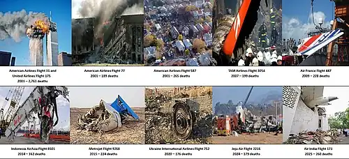 The greatest number of passenger fatalities involving one airline in a single calendar year occurred in 2014 with Malaysia Airlines, with 537 people dead (presumably - with the wreckage unrecovered, the death toll is not entirely confirmed) in two tragedies: disappearance of Flight 370 on 8 March and the shootdown of Flight 17 on 17 July. When including ground fatalities, American Airlines holds this distinction, with the 2001 crashes of Flight 11 and Flight 77 on 11 September, and Flight 587 on 12 November, with a combined total of approximately 2,000 deaths, including 416 people on the three aircraft.[4] The deliberate crashes of the aforementioned American Airlines Flight 11, as well as United Airlines Flight 175 at the World Trade Center, and the subsequent collapse of both towers on 11 September 2001 caused 2,606 ground fatalities in addition to the deaths of the 157 people on board both flights, making it the deadliest aviation disaster in history.[5][6]