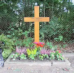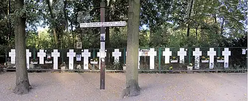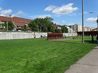 When Berlin was a divided city, the Berlin Wall ran along Bernauer Straße. The street itself belonged to the French sector of West Berlin and the East German authorities declared that the windows and doors that led out onto Bernauer Straße should be bricked up. In the early morning of 22 August 1961, Ida Siekmann was the first of 98 people to die while attempting to escape. She was living on the fourth floor of number 48 (third floor, 3te Stock, by German standards), threw bedding and some possessions down onto the street, and jumped out of the window of her apartment.[19][20][21] She fell on the sidewalk and was severely injured, dying shortly afterwards on her way to the Lazarus Hospital.[19][22]