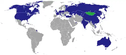 This is a list of diplomatic missions in Mongolia. The capital city Ulaanbaatar currently hosts 26 embassies. Many other countries have non-resident embassies either resident in Beijing, Seoul, or elsewhere.