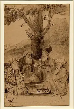 Four Orientals Seated under a Tree | c. 1656 | Pen and brown ink with brown and grey wash, touched with white and with some scraping-out, on oriental paper prepared with pale brown wash | 19.4 x 12.4 cm | British Museum, London | The drawing is related to the etching B029