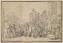 Paul and Barnabas at Lystra | c. 1637 | Sanguine | 29.8 x 44.2 cm | Musée Bonnat, Bayonne | Inscribed een vrouw wijst op een jonck kind |
