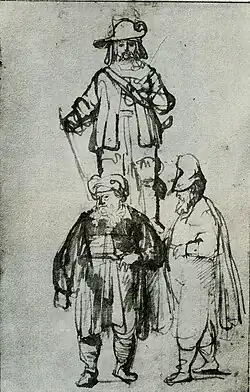 Studies of an Officer, an Oriental and a Man in High Cap | c. 1641-1642 | Pen | 21.2 x 13.4 cm | Musée du Louvre, Paris | The drawing is related to the painting W190