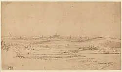 View of Haarlem with the Saxenburg Estate in the Foreground | c. 1650-1651 | Pen and brown ink, brown wash, heightened with white | 8.9 x 15.2 cm | Museum Boijmans Van Beuningen, Rotterdam | The drawing is related to the etching B234