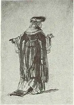 Woman in a Rich Dress and a Fur Hat, Seen from Behind | c. 1639 | ? | ? | Museum der bildenden Künste, Leipzig | The drawing is related to the etching B109