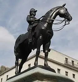 Statue of Frederick Roberts, 1st Earl Roberts | Horse Guards Road, Whitehall | 1924 | Henry Poole after Harry Bates | Statue on pedestal | Bronze and stone | Grade II | Q21286417 | Richard Allison (architect).[24] | |