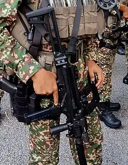 | M4A1 | Carbine | Army, Navy, Air Force | Manufactured locally by SME Ordnance.[12] Standard service rifle of the Malaysian Armed Forces. |