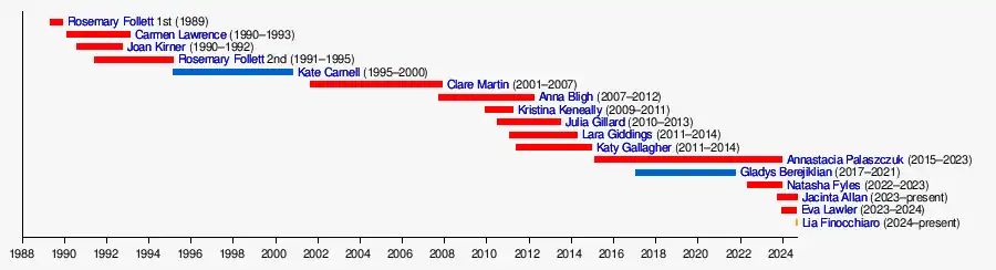 - ^ Appointed 42nd Premier of New South Wales in December 2009, following a Labor Party leadership challenge against Nathan Rees. Defeated at the state election in March 2011, by Barry O'Farrell (Liberal). First woman Premier of New South Wales.[7]