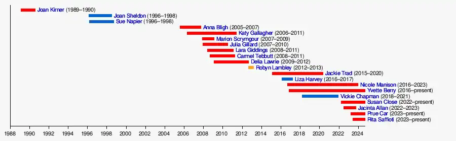 | Susan Close | South Australia | Labor | Peter Malinauskas | 21 March 2022 | Incumbent | 3 years, 152 days[27] | |