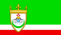 A vertical tricolour of red (for the Bosnian Croats), white, and green (for the Bosniaks), with a coat of arms on the wide central band on which the green arms and golden fleur-de-lys represents the Bosniaks, and the checked shield the Bosnian Croats.