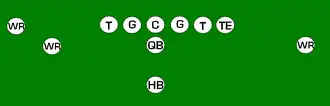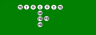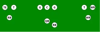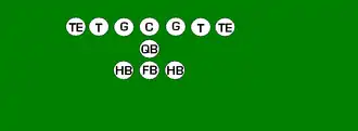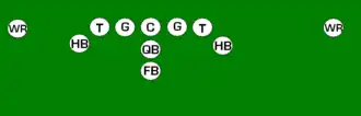 One variation of the T Formation would be where all the running backs would be closer than usual, being at fullback depth rather than halfback depth. Another variation of the "balanced T" formation is the so-called "unbalanced T" formation.[2] In this configuration the line of scrimmage has an end and tackle left of center, while to the right of the center are two guards, a tackle, and an end. This creates a line that is weighted toward the right of the center. With the backfield lining up in the conventional T formation behind the center (quarterback, two halfbacks and fullback), the resulting configuration is "unbalanced" due to the asymmetry of the placement of the linemen. The "split T" spreads the offensive line out over almost twice as much ground compared to the conventional T formation. This causes the defensive line to also spread out, creating gaps the offense can exploit.[3]