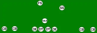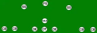 This is the base defense of some teams. It consists of three defensive linemen, four linebackers, and four defensive backs (two safeties, two corners). The advantage is that while 4 players still usually rush the line, the quarterback can be less sure of which of the 4 linebackers will join the 3 linemen. This formation sacrifices some size (of linemen) for speed (of linebackers), but coaches choosing to utilize this formation as their base defense typically choose larger players in the front 7 to make up for the shortage of size. In this formation, the single tackle usually lines up directly over the "nose" of the ball, and is often called the "nose guard" or "nose tackle". The "Nose Tackle" is still a DT (Defensive Tackle) with a different name. In this formation, the linemen often line up directly in front of the offensive line, while the linebackers "shoot the gaps". There is also a variation of this defense called the 3-4 under defense. This defense is a one gap version of the 3–4 defense.