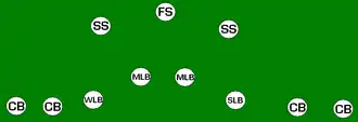 The 3–5–3 refers to a defense that has three down linemen (the "3" level), three linebackers and two corners (the "5" level), one free safety and 2 strong safeties (the "3" level). This is similar to a 33 stack, but with players more spread. Also called the "umbrella" defense or "3-deep". In this set, the third safety would be referred to as a "weak safety" (WS) and allows two position safeties at the mid-level with a third safety deep. It is because of this that the secondary safety in a football defense is called a free safety rather than a weak safety