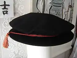 Tudor bonnet | A soft round black academic cap with a stiff brim that has a cord with tasseled ends knotted around the base of the crown, the ends draping over the brim. | |