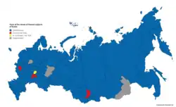 The following is a list of heads of the federal subjects of the Russian Federation. The Republic of Crimea and the city of Sevastopol, along with the Donetsk People's Republic, Kherson Oblast, the Lugansk People's Republic and Zaporozhye Oblast were annexed by Russia between 2014 and 2022 and, according to its constitution, are Federal subjects. However, internationally these entities are recognized as part of Ukraine.