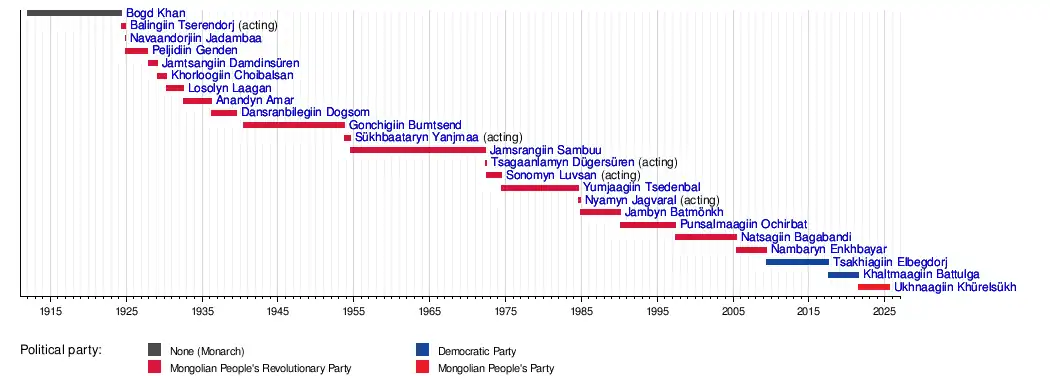 | 1 | Bogd Khan (1869–1924) | 29 December 1911 | 20 May 1924 † | 12 years, 143 days | The 8th Jebtsundamba Khutuktu | |