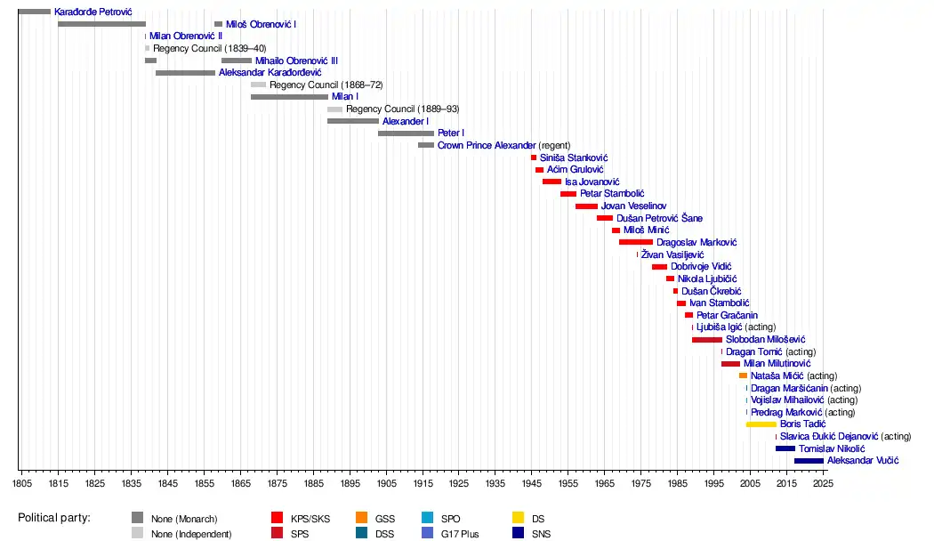 The list includes the heads of state of Revolutionary Serbia; the independent monarchies of Principality of Serbia and Kingdom of Serbia; the People's Republic of Serbia / Socialist Republic of Serbia, a constituent republic of the Federal People's Republic of Yugoslavia / Socialist Federal Republic of Yugoslavia; the Republic of Serbia, a constituent republic of the Federal Republic of Yugoslavia / State Union of Serbia and Montenegro; and the Republic of Serbia, an independent state.