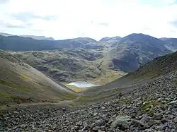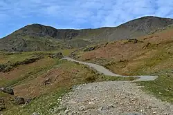 Historically the region was suitable for sheep hill farming and from medieval (or possibly Roman) times there was a substantial mining industry for rocks and minerals.[1] The Romans had built a high-level military road north–south right through the region on its eastern edge at High Street and another road through the Hardknott and Wrynose passes for travel between forts at Ravenglass and Ambleside.[18] Travelling between valleys was difficult on foot or by pony because of the steep passes across the mountainous ridges. With no roads suitable for wheeled traffic until the late 18th century, for long-distance transport of goods long trains of horses were used with ridge routes being preferred although Esk Hause and Stake Pass (see below) are thought to have been used in this way. However, for travel within the region, routes were best kept as low as possible consistent with avoiding excessive detours so summits and ridges were to be avoided as far as possible.[19]
