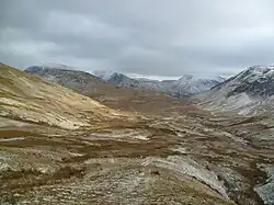 From about 2 million years ago glacial erosion then greatly modified the landscape.[1][16] Glaciers formed preferentially at existing streams which had developed at the many rock faults produced by crushing during the continental collision. The terrain was ground away leaving characteristically steep-sided glacial valleys which became ribbon lakes.[1] On the Rossett Pass (see below) Rossett Gill is an example of a geological fault and the glacier that descended from it created the Mickleden and Great Langdale valleys below.[17] Taken as a whole the region is characterised by mountain ridges splaying out from a central core. The intervening valleys have been made by glaciers flowing outward along the lines of the previous streams draining the dome of the Lake District.[1]