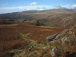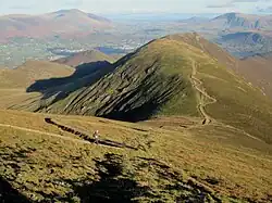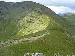 In the late 18th century the region started to become popular with travellers and the "Lake Poets" began seeing the lakes and mountains as beautiful rather than horrifying.[20] In Victorian times, encouraged by the arrival of the Kendal and Windermere Railway,[1] a tourist trade developed. In the mid twentieth century Alfred Wainwright inadvertently encouraged further recreational use with his series of books A Pictorial Guide to the Lakeland Fells which described detailed routes to the major summits. His considerable knowledge of the district allowed him to make use of the ancient tracks although his focus was not on the ridge passes themselves.[21]