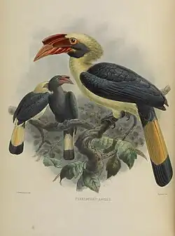 Hornbills are birds in the families Bucerotidae and Bucorvidae. There are currently 62 extant species of hornbills recognised by the International Ornithologists' Union, two in Bucorvidae and 60 in Bucerotidae.[1] Many species of fossil hornbills are known from the Miocene onwards; however, their exact number and taxonomy are unsettled due to ongoing discoveries.