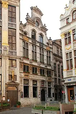 House of the Corporation of Carpenters | Former property of the Corporation of Carpenters, whose tools decorate the façade since the 15th century. Built in stone in 1644, partly spared by the bombardment, it was rebuilt (from the third floor up) and restored (lower levels and interior) in 1697 by the carpenter Antoine Pastorana.[9] The sculptures from this reconstruction are the work of Peter van Dievoet and Laurent Merkaert.[10] The façade was restored in 1854–1858 by the City of Brussels' architect, Victor Jamaer, and again in 1907–1913 by the architect Jean Segers.[9] Nowadays, a Starbucks coffee shop is located on the ground floor of this building. |