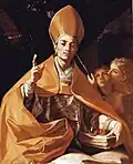 The braccio santo or holy arm of Bonaventure has been kept as a relic by the Cattedrale San Bonaventura in a chapel to the right of the church's nave since it was brought there in 1491. The only extant relic of Bonaventure is the right arm and hand with which he wrote his Commentary on the Sentences, which is now conserved at Bagnoregio, in the Cathedral of San Nicola and San Donato. It is kept in a silver, arm-shaped reliquary.[25][26][27] | |