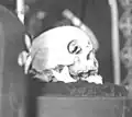 During Beethoven's autopsy, pathologist Johann Wagner[12] sawed Beethoven's skull open and cut out his temporal bones. When his body was exhumed in 1863, the temporal bones and six of his teeth were missing. His skull was in nine pieces. Some fragments were taken before the body was reinterred. They were later found to be held by Franz Romeo Seligmann.[13][14] |