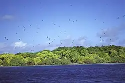 | Pig Islet | 72,000 m2 | Named for a population of domestic pigs introduced in 1828 and re-introduced in 1848, there is today no evidence of any adverse effect from the introduction of that non-indigenous species (no longer present). Like other islets, a large Cocos population was planted in 1920, but now occurs infrequently on the island. Pig's Pisonia forest covers 46% of the islet—the largest proportion of any islet in the atoll. | ![]() Noddies and terns next in Pig's extensive Pisonia forest. | |